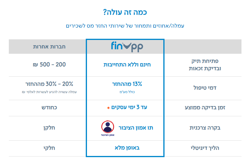 לשם השוואה: בחברות החזרי מס למיניהן ייקחו לכם דמי הרשמה של 100-300 ש"ח ובנוסף 20%-30% מההחזר, עמלה שתסתכם באלפי שקלים.